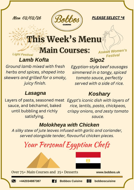 •Lamb Kofta •Sigo2 •Lasagna •Koshary •Molokheya with Chicken