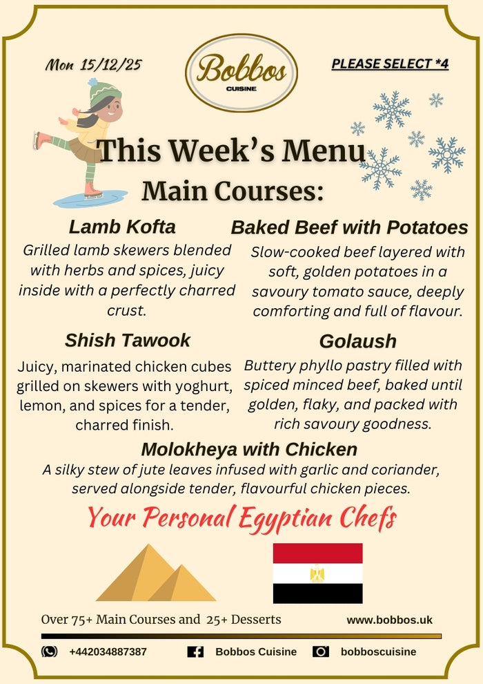 Each Friday, we send out the new menu via Whatsapp, featuring five main dishes.