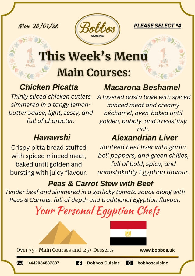 •Chicken Picatta •Macarona Beshamel •Hawawshi •Alexandrian Liver •Okra Stew with Beef